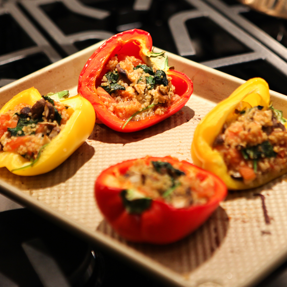 I only recently started loving peppers. They’re so easy to throw into stir-fry or to scoop out and fill with quinoa and other veggie goodness. I love this recipe not only because of the simplicity but also because it looks so pretty. You will totally wow your guests if you make these at your next dinner party.